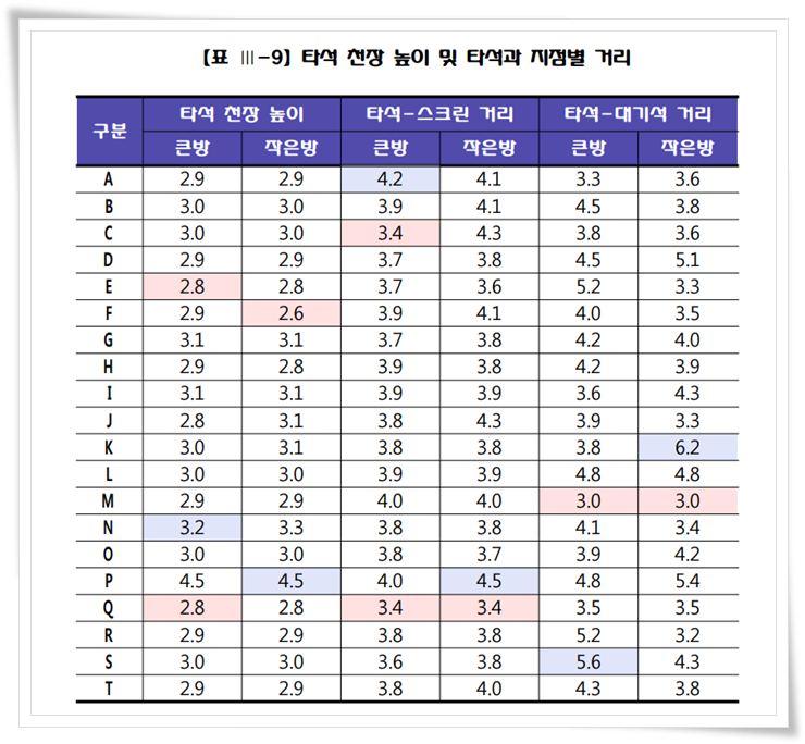 이상과 같이 관계법령에는 타석간의 최소 거리만 규제하고 있습니다. 하지만 현실적으로 스윙을 하기 위한 공간은 천장높이 2.7미터, 타켓까지 거리 3미터를 확보해야 가능합니다.